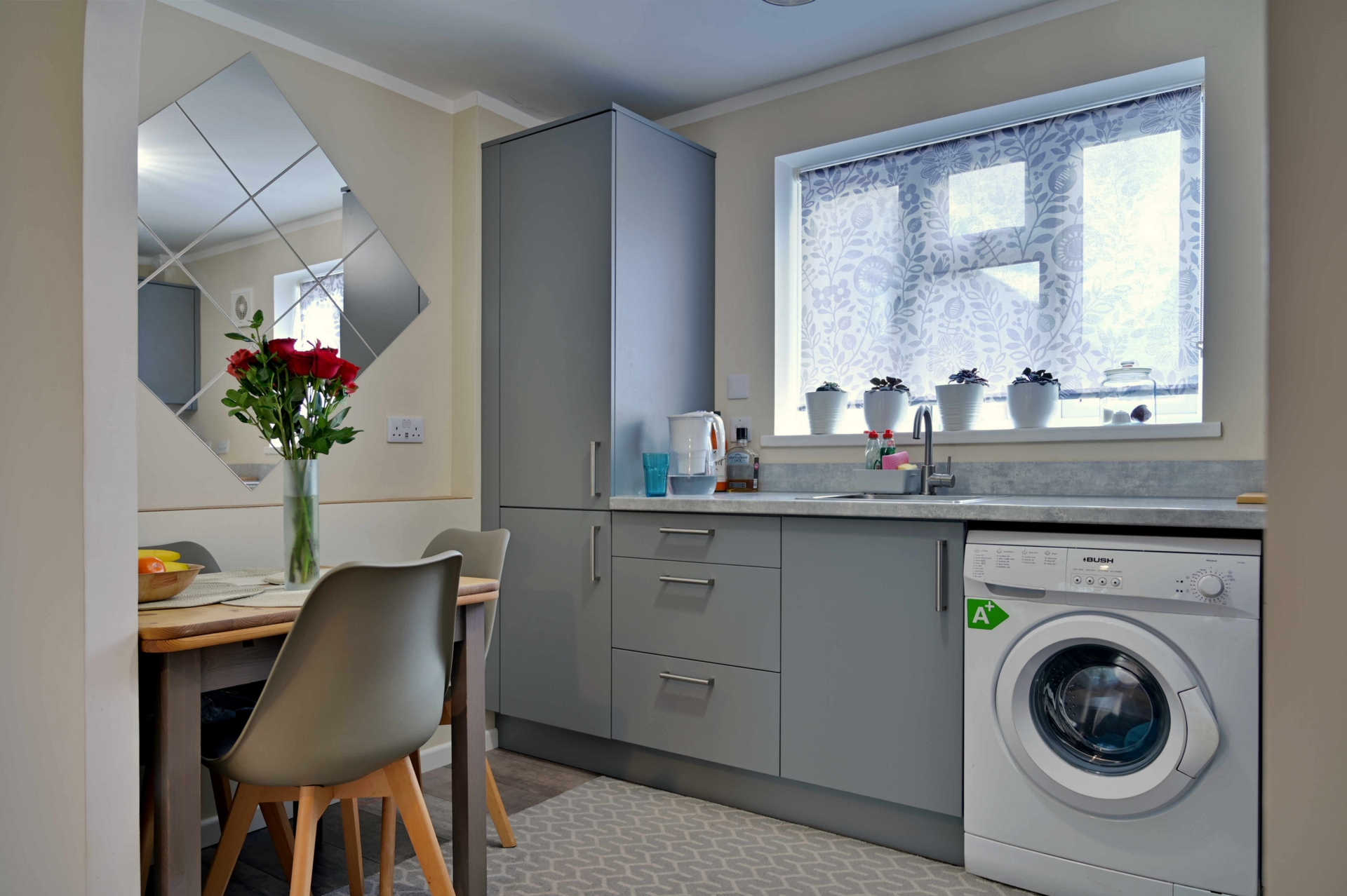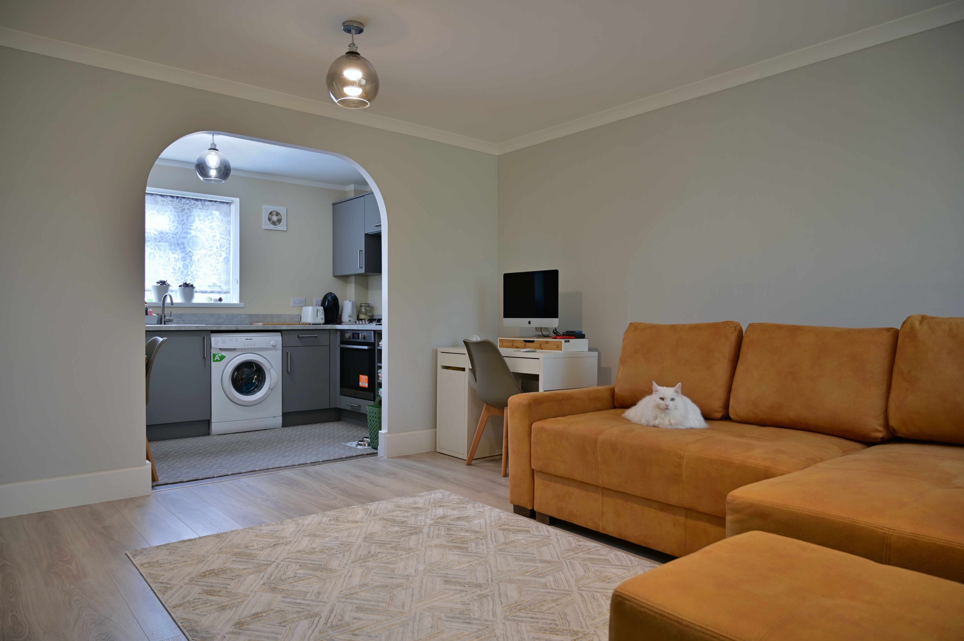 The front door leads into an entrance hall which in turn provides access to the lounge, bedroom and family bathroom. There is a recessed storage area for coats and shoes. The lounge is open plan to a modern re-fitted kitchen, including a range of base and eye level units incorporating drawers and cupboards, with integrated electric oven, gas hob, fridge freezer and further space & plumbing for a washing machine. There is room for a small table and chairs, taking care of all your dining needs.
