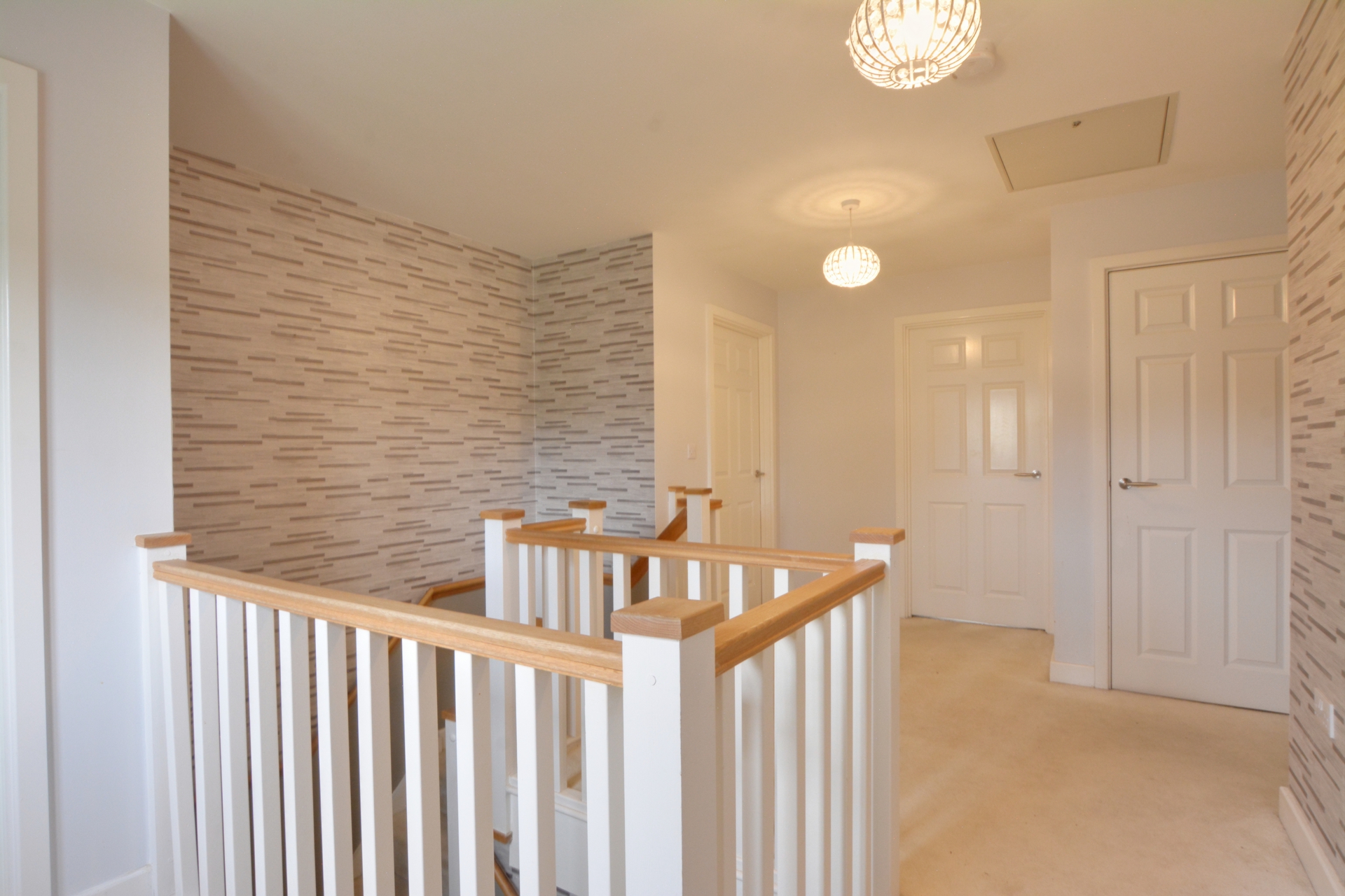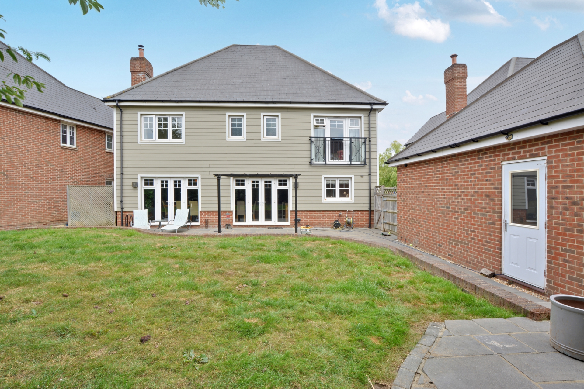 Moving upstairs you are greeted by a generous landing which provides access to all bedrooms, bathroom and loft space. The super king-size master bedroom is located to the rear of the property allowing you to enjoy views of the garden. The room is fitted with a quadruple wardrobe with sliding doors, whilst still being able to accommodate a super king size bed. A Juliette style balcony also enhances your enjoyment of the views over the garden. The en-suite incorporates a double shower cubicle, wash hand basin and low-level w/c all set against stylish tiling. Bedroom two is a double room located at the front of the property which takes in views out over the green and pond. The room can comfortably hold a king size bed with free standing furniture and is fitted with double wardrobes. Bedroom three is a double room and again takes in view over the green and pond. It too can comfortably hold a king size bed and is fitted with a double wardrobe. Bedroom four, is again a double bedroom with space for furniture and views over the rear garden. Bedroom five which is currently set up as a walk-in wardrobe is the smallest of the rooms and is a generous single room. The family bathroom is generous size, with double shower cubicle, bath with hand held shower attachment, wash hand basin and low-level w/c, again it’s all set against stylish tiling.